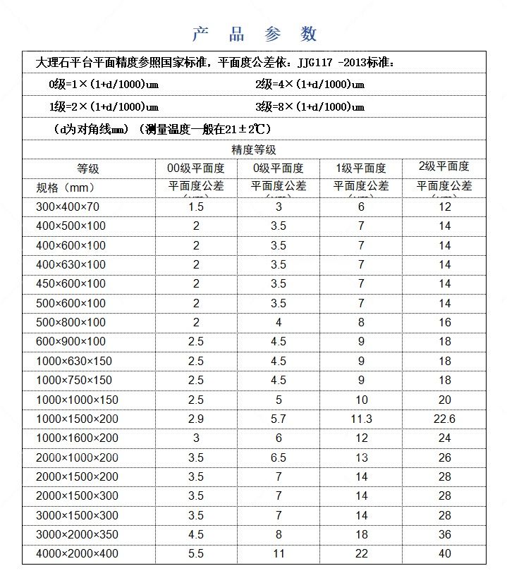 (d为对角线mm)(测量温度一般在21±2℃大理石平台比重:2970-3070kg/㎡抗压强度:245-254N/m线膨胀系数:4.61×10-6/℃,吸水率:<0.13%肖氏硬度:Hs70以上