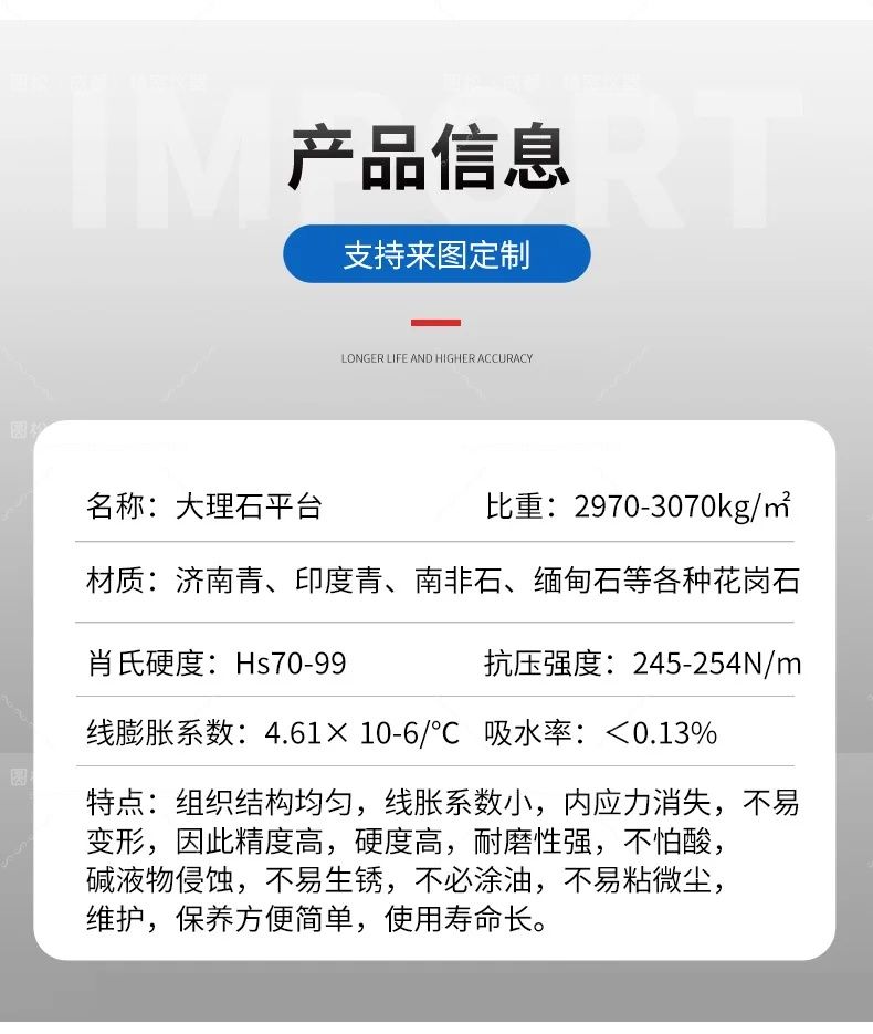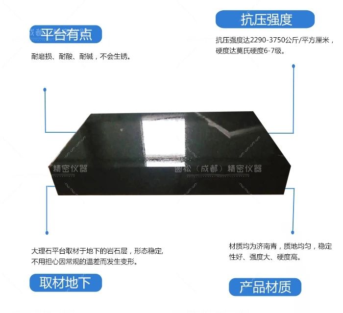大理石平台取材于地下优质的岩石层,经过亿万年自然时效,形态极为稳定,不用担心因常规的温差而发生变形。经严格物理试验和选择的花岗石料,结晶细密,质地坚硬,抗压强度达2290-3750公斤/平方厘米,硬度达莫氏硬度6-7级。极耐磨损、耐酸、耐碱,有很高的耐腐蚀性,永远不会生锈。由于大理石系非金属材料,无磁性反应,亦无塑性变形。其硬度比铸铁高2-3倍(相当于HRC>51),因此精度保持性好。在使用中岩石工具即使遭重物磕碰,至多掉几粒石碴而已,而不会像金属工具那样,因变形而破坏精度。其优于优质铸铁和钢材制作的精密测量基准零件,可以获得高而稳定的精度。
