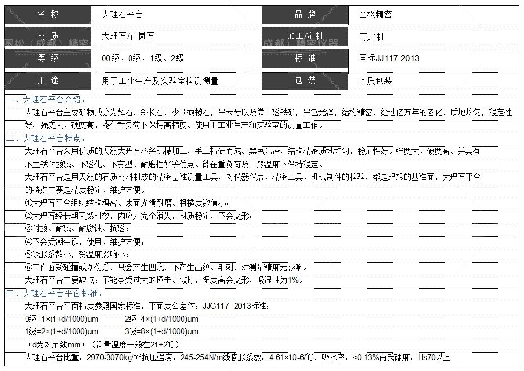 大理石平板比重:2970-3070kg/㎡,抗压强度:245-254N/m㎡,线膨胀系数:4.61×10-6/℃,吸水率:<0.13%,肖氏硬度:Hs70以上